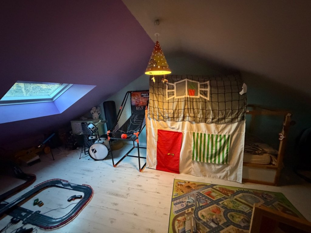 Le coin nuit principal comprend une chambre. une salle de bains équipée d'une porte coulissante, laquelle dessert également un dressing pratique, puis les toilettes séparées. En continuité de cet ensemble, un bureau donne accès aux combles aménagés : ces combles climatisés comprennent deux chambres supplémentaires, une salle de jeux, ainsi qu'un point d'eau avec lavabo, douche, baignoire et toilettes, offrant des possibilités d'aménagement variées selon vos besoins (chambres d'enfants, espace loisirs, bureau ou chambre d'amis). Les combles sont éclairés naturellement par des velux et bénéficient eux aussi d'une climatisation.